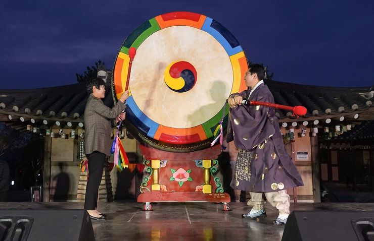 [한국기자연대] 박경귀 아산시장과 김희영 아산시의회 의장이 두드리는 웅장한 대북소리와 함께 3년 만에 재개되는 외암민속마을 짚풀문화제의 막이 올랐다.
