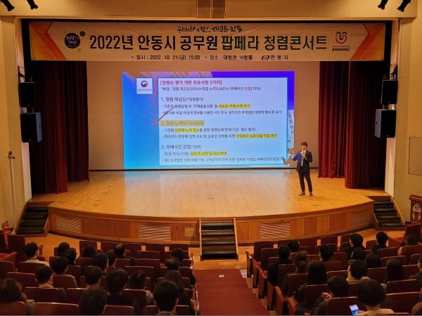[한국기자연대] 안동시는 10월 21일 안동시청 대동관 낙동홀에서 직원 400여 명이 참석한 가운데 『2022년 안동시 공무원 팝페라 청렴콘서트』를 개최했다.