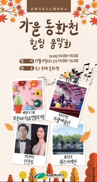 [한국기자연대] 대구 북구청은 10월 29일과 11월 5일 2일간 '문화가 흐르는 행복북구-일상탈출! 가을음악회 행사'를 개최한다.