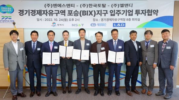 경기경제청은 24일 오후 2시 8층 회의실에서 ㈜엔에스앤티, ㈜한국토탈, ㈜엘앤디, 평택시와 평택 포승(BIX)지구 산업·물류시설 용지 입주를 위한 투자협약을 체결했다.