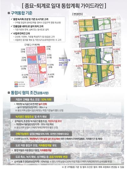 서울시가 마련한 종묘~퇴계로 일대에 적용되는 지침(가이드라인)은 지난 4월 시가 발표한 「녹지생태도심 재창조 전략」의 규제완화방안을 보다 구체화한 것이다. 큰 틀에서 ▴구역통합 기준 등 개발방향 ▴규제완화사항 ▴공공기여 방안 등을 담고 있다.