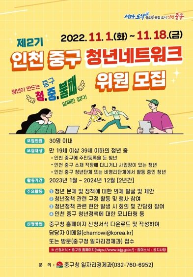[한국기자연대] 인천 중구은 청년의 다양한 욕구와 의견을 반영한 정책을 발굴·제안할 '제2기 인천 중구 청년 네트워크'구성원을 11월 1일부터 18일까지 모집한다.