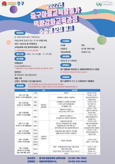 역량강화교육과정은 총 15~25명 내외로 모집한다. 만 18세 이상의 중구 거주민으로서 마을교육에 관심이 있는 누구나 무료로 수강할 수 있으며, 10월 31일까지 중구 평생교육과 방문 접수와 이메일로 접수가 가능하다.