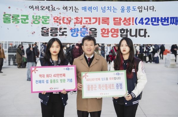 이날 행운의 주인공은 포항발 울릉크루즈 편으로 울릉도를 찾은 울산광역시에서 오신 윤기철 씨로, 2박3일의 가족여행 일정으로 울릉도를 방문해 42만 번째 깜짝 행운의 주인공이 됐고, 42만 1번째 관광객은 부산광역시에서 온 부산해양대학교 외국인 대학생 37명이 당첨됐으며, 이들에게는 울릉사랑상품권과 지역특산물세트, 여객선승선권(울릉크루즈 후원) 등이 제공됐다.