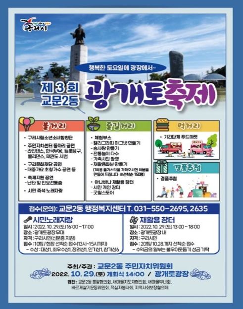 [한국기자연대] 구리시에서는 교문2동 주민자치위원회(위원장 이종성) 주관으로 10월 29일 광개토태왕 광장 일원에서 “제3회 광개토축제”를 개최한다고 밝혔다.