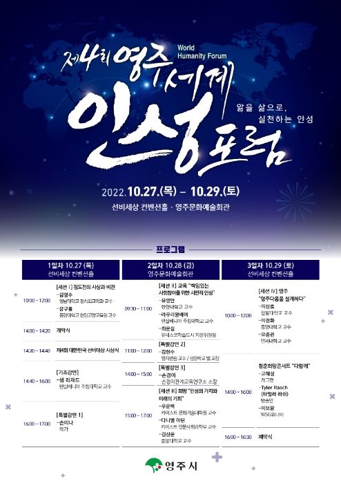 한편 ‘제4회 세계인성포럼’은 오는 29일까지 선비세상과 영주문화예술회관에서 진행되며 코로나19로 인해 세계인성포럼 공식 유튜브(채널명:세계인성포럼)를 통해 실시간 중계된다.