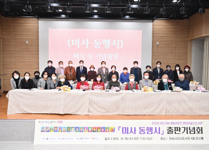28일 하남시에 따르면 하남시립도서관은 지난 26일 하남시미사도서관 4층 미사홀에서 이현재 하남시장, 강성삼 하남시의회 의장을 비롯해 정병용 하남시의회 자치·행정위원회 위원장, 오승철 하남시의원 등 관계자 70여명이 참석한 가운데 ‘2022 찾아가는 예술처방전 사업-미사 동행시’ 출판기념회를 개최했다.
