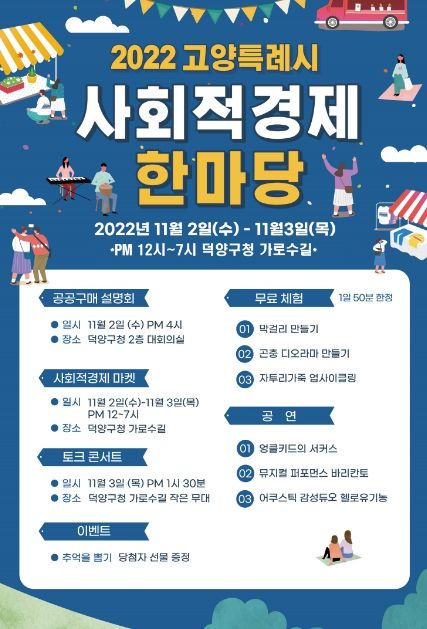 [한국기자연대] 고양특례시는 오는 11월 2일부터 11월 3일까지 고양시 덕양구청 일원에서 공공구매 설명회를 비롯해 사회적경제 마켓, 토크쇼 등 사회적경제 제품 및 서비스를 알리는‘2022 고양특례시 사회적경제 한마당’을 개최한다고 밝혔다.