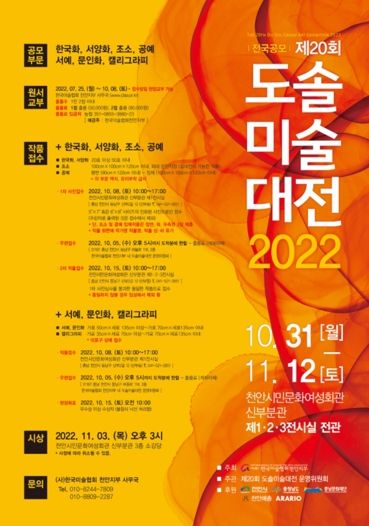 1부와 2부로 나뉘어 진행되는 제20회 도솔미술대전은 1부 10월 31일부터 11월 5일까지는 한국화, 서양화, 조소, 공예 부문 작품을 전시하고, 2부 11월 6일부터 12일까지는 서예, 문인화, 캘리그라피 부문 작품을 선보인다.