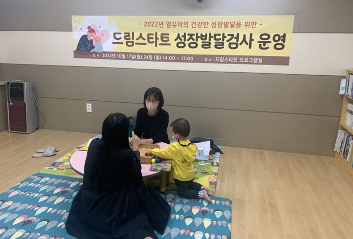 ‘드림스타트 성장발달검사’는 인지·언어, 사회성 등 발달 지연이 우려되는 아동들을 대상으로 한국형 덴버Ⅱ 검사를 통해 4개 영역 110개 항목을 검사해 아동의 발달 지연을 검사하는 프로그램이다.
