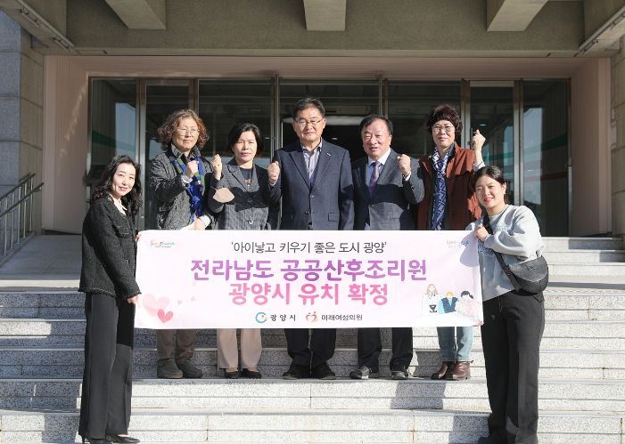 시는 그 목적으로 ‘공공산후조리원 설립’을 공약사항으로 추진해 왔으며, 지난 9월 26일 광양시와 광양시의회, 미래여성의원, 광양시 여성단체협의회 등 5개 기관, 6개 단체가 전라남도 공공산후조리원 유치와 운영 지원을 위한 공동 업무협약을 체결했다.