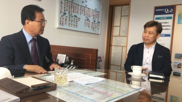 유희태 완주군수는 1일 오전 군청을 방문한 메탄올 기반의 연료전지(DMFC) 기술을 보유한 수소 전문기업 가온셀의 윤경용 사장과 지역 수소산업 활성화 방안 등에 대해 대화를 나누고 지역업계의 애로사항을 청취했다.