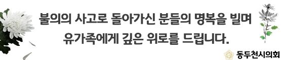 김승호 의장은“안타까운 사고에 너무나 황망하고 슬픈 마음뿐”이라며, “유명을 달리한 분들의 명복과 부상자들의 쾌유를 기원하며, 동두천시의회 모든 의원은 엄숙한 마음으로 의정활동에 차분히 임할 것”이라고 밝혔다.