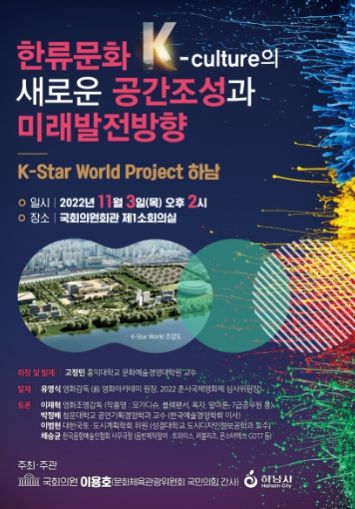 ‘한류문화K-culture의 새로운 공간조성과 미래발전방향’을 주제로열리는 이번국회토론회는 국회 문화체육관광위원회 간사인 국민의힘 이용호 국회의원이 주최하고 하남시가 주관한다.