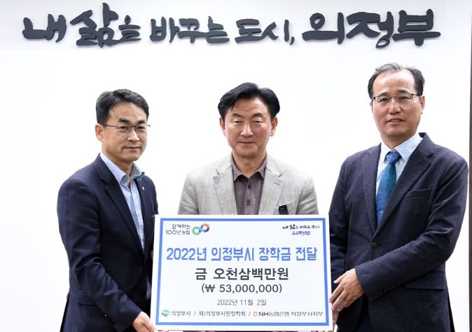 [한국기자연대] 의정부시는 NH농협은행 의정부시지부가 11월 2일 (재)의정부시민장학회에 장학금 5,300만 원을 전달했다고 밝혔다.
