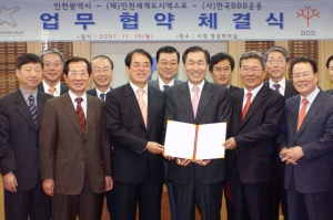 안상수 인천시장과 2009 인천세계도시엑스포 강동석 조직위원장, (사)한국BBB운동 이제훈 회장은 19일 오전 인천시청 영상회의실에서 2009 인천세계도시엑스포의 성공적 개최와 ‘글로벌 랭귀지 존, 언어장벽 없는 도시’ 구현을 위해 공동협력을 다짐하는 업무협약식을 가졌다.