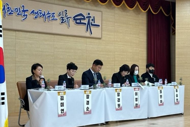 순천시의회 행정자치위원장 이영란 의원을 좌장으로 5명의 의원이 순천시의 성평등 현안을 살피고 의정활동 방향을 밝히는 릴레이 발언에 나섰다.