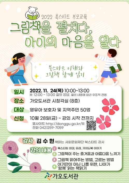 [한국기자연대] 대전광역시 동구는 11월 24일 10시 동구청 8층 가오도서관 시청각실에서 영유아 보호자와 지역주민을 대상으로 북스타트 부모교육을 개최한다.