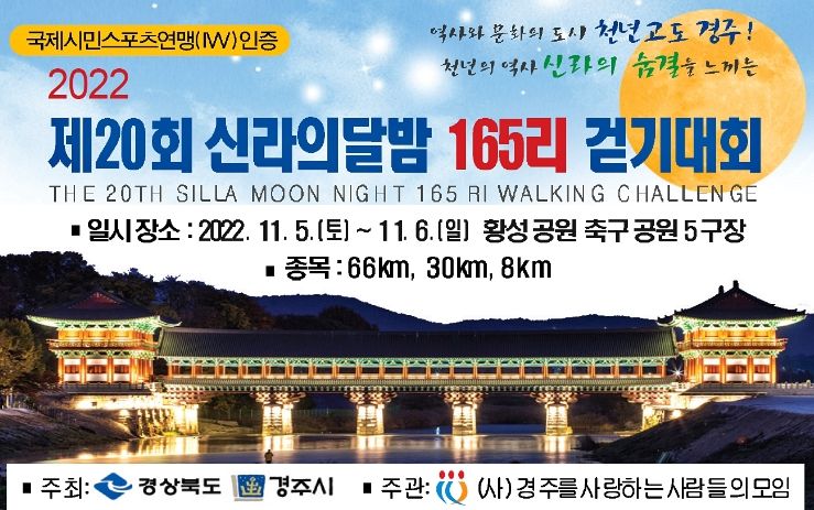 경주시와 경북도가 주최하고 (사)경주를 사랑하는 사람들의 모임이 주관하는 ‘신라의 달밤 165 걷기대회’는 올해로 20회째를 맞는 대회다.