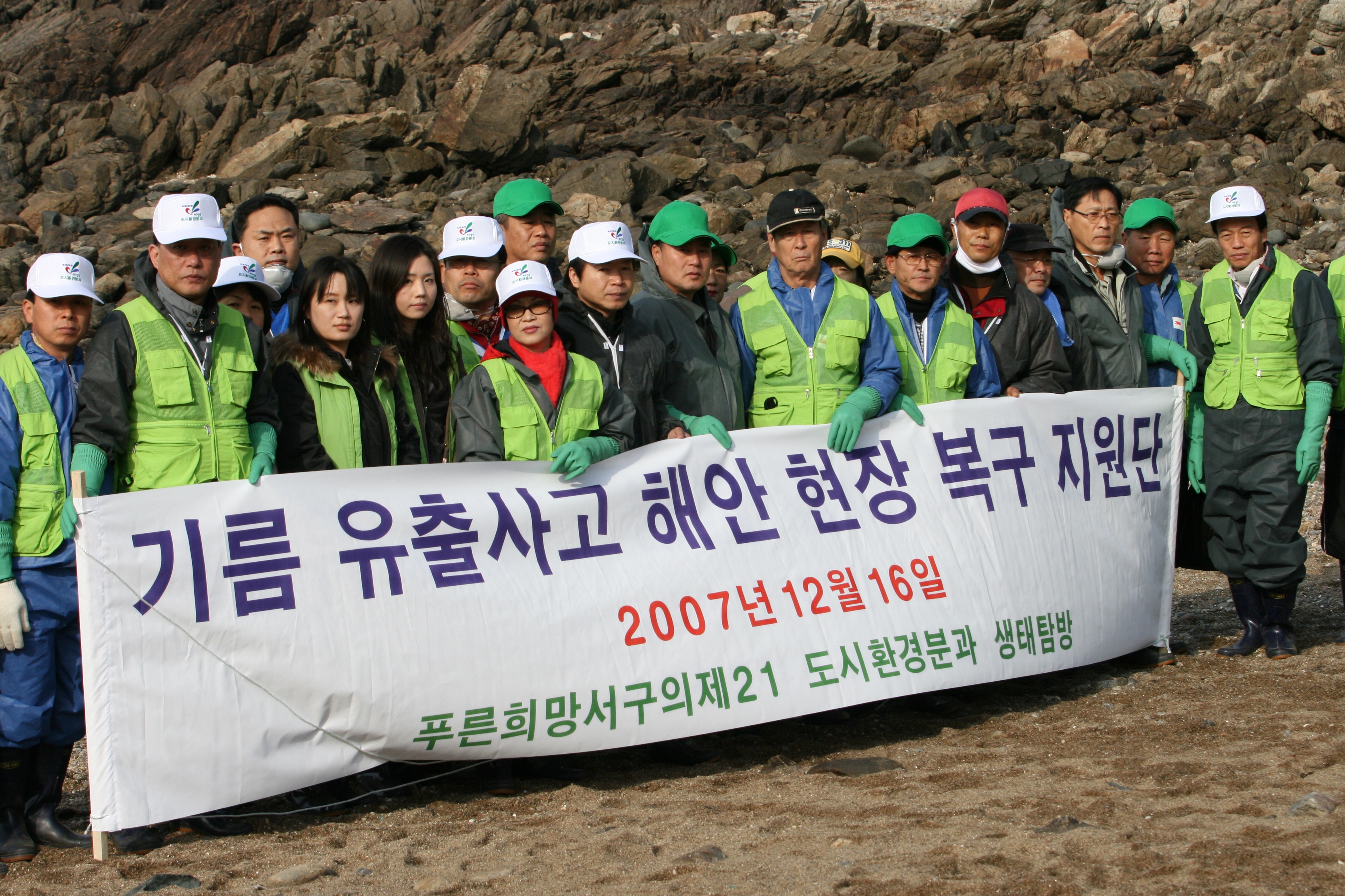 16일 인천 서구의제 21 도시환경분과위원회(위원장 조성직) 회원과 충청환경산악회, 교통장애인협회 인천지부, 인천베트남참천유공자연합회 서구지부, 공촌천네트워크, 국가유공자문화재단, 한국기자연대 자원봉사자 30명은 원유 유출사고로 큰 피해를 입고 있는 천혜의 절경을 자랑하는 충남 태안군 이원면 일대 갯바위에서 원유 제거작업에 구슬땀을 흘렸다