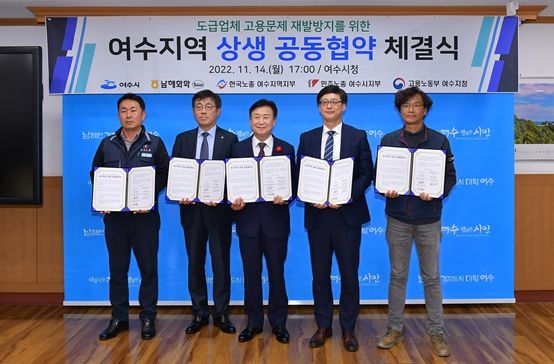 [한국기자연대] 여수시가 지난 14일 여수시장실에서 남해화학 도급업체의 고용문제 재발 방지를 위한 ‘지역 상생 공동협약’을 체결했다.