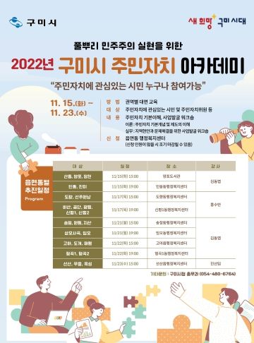 [한국기자연대] 구미시는 11. 15.부터 11. 23.까지 양포도서관, 각 읍면동행정복지센터에서 지역을 고려하여 읍면동 권역별로 총 9회에 걸쳐 주민자치위원 등 주민자치에 관심 있는 시민 대상『2022년 구미시 주민자치 아카데미』를 를 실시한다.