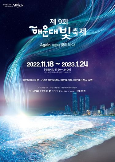 어게인(Again), 해운대 빛의 바다, ‘제9회 해운대 빛축제’는 해운대구와 해운대빛축제조직위원회가 공동 주관한다. 내년 1월 24일까지 68일간 해운대해수욕장, 구남로 해운대광장, 해운대시장, 온천길 일대를 빛 조형물로 꾸민다. 권역별로 천지가 빛나다, 빛을 모으다, 반짝하늘, 금빛거리 등 4개 주제로 빛을 밝힌다. 축제 기간 오후 5시 30분부터 밤 12시까지 점등한다.