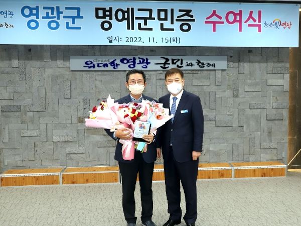 아울러, 어촌뉴딜사업, e-모빌리티 정책사업, 상수도 현대화사업, 정수장 시설개량사업 등 영광군 발전을 위한 국고 예산 확보에 크게 기여하여 영광군 명예군민 제3호로 선정되어 명예군민증을 수여 받았다.