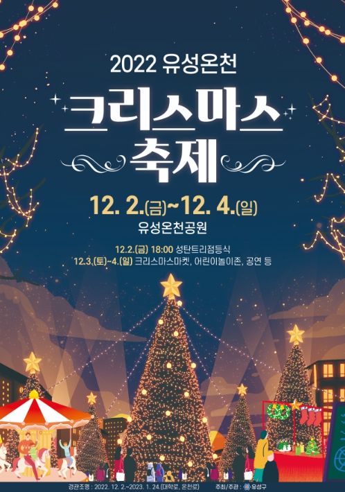 유성온천문화축제의 겨울 버전으로 기획된 이번 축제는 12월 2일 성탄트리 점등식을 시작으로 3일과 4일 양일간 ▲크리스마스마켓, ▲어린이놀이존(꼬마기차), ▲크리스마스 공연 등이 펼쳐진다.
