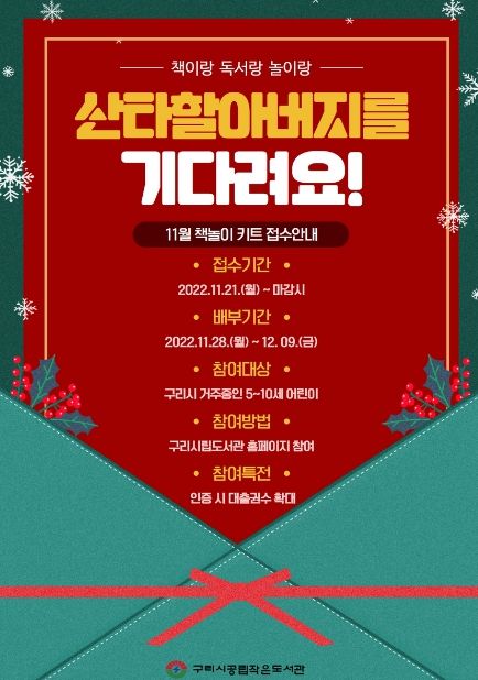 [한국기자연대] 구리시 공립작은도서관 5개소에서는 오는 21일부터 ‘산타할아버지를 기다려요’라는 주제로 선착순 접수(총 60명)를 통해 책놀이 키트를 무료 배부하는 이벤트를 진행한다.