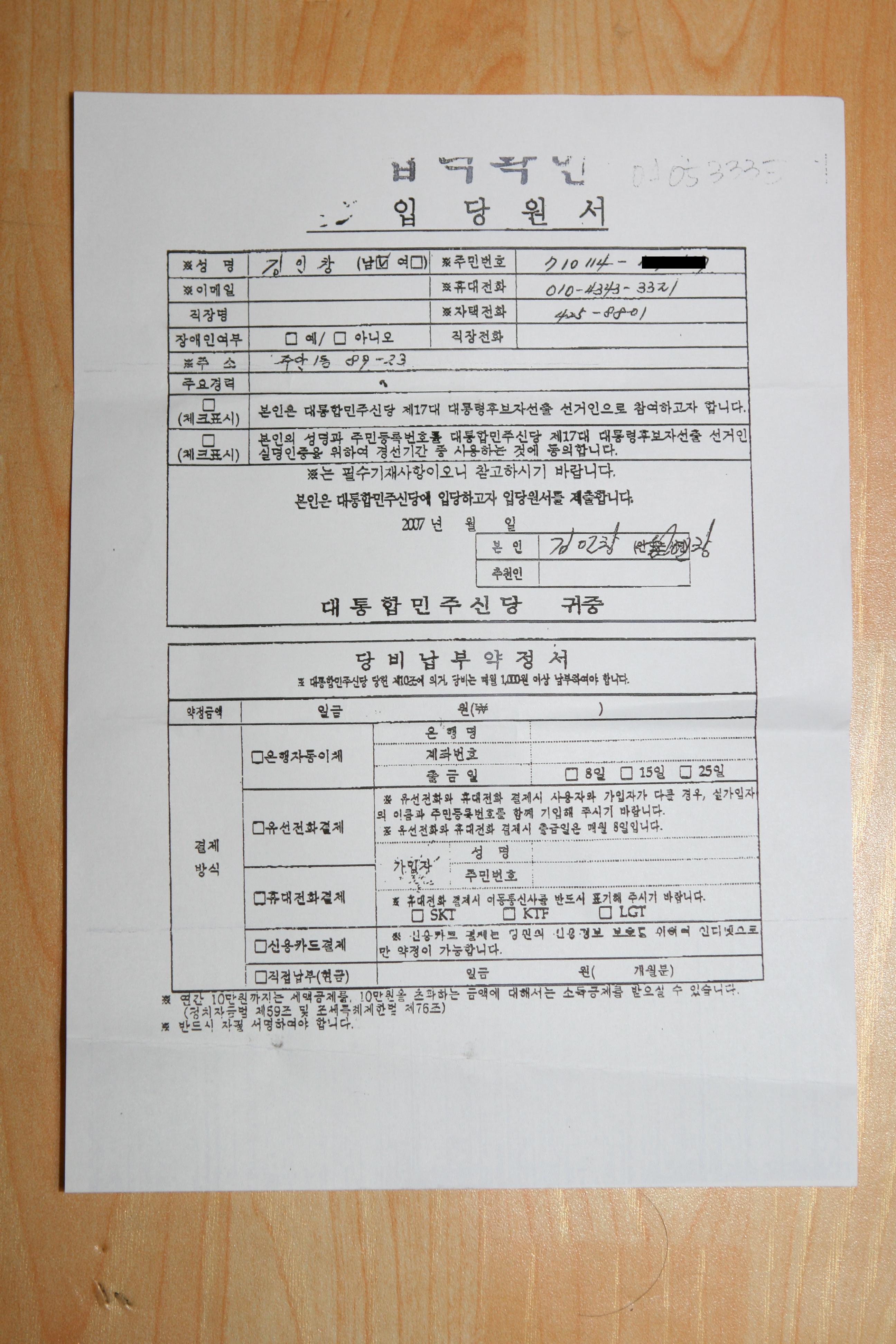 팩스로 보낸 51매 중에 날짜와 추천인도 없는 위조된 자신의 입당원서를 확인했다"면서 "입당원서에 대한 친필 유무와 사법당국에 고발하여 입당과 관련한 진위여부를 밝히겠다"고 주장했다