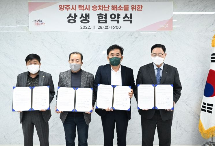 [한국기자연대] 양주시는 지난 28일 시장실에서 양주시의회, 개인택시운송사업조합 양주시조합, ㈜양주상운·와이제이협동조합과 택시 승차난 해소를 위한 상생협약을 체결했다고 밝혔다.