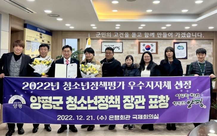 양평군은 ‘청소년이 주도하여 미래를 꿈꾸는 양평군 구현’을 목표로 ▲지역사회가 함께하는 청소년 전용공간 인프라 확대 ▲청소년의 정책참여 확대 및 활동기반 지원 ▲누구나 누리는 청소년 문화 활성화 ▲청소년보호사업으로 건강한 성장 지원 등 청소년 중심의 정책을 추진한 공로를 인정받았다.