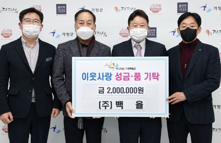 [한국기자연대] 12월 21일, (주)백율에서는 연말을 맞아 소외되고 어려운 이웃을 위해 이웃돕기 성금 200만원을 군에 기탁하여 전달식을 가졌다.