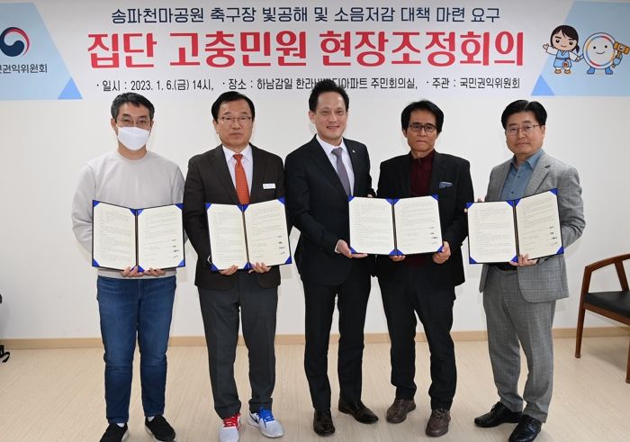 이날 김태규 국민권익위 부위원장 주재로 열린 현장조정회의에서 이현재 하남시장, 정광순 송파구 도시현대화국장, 주민대표 등이 참석한 가운데 송파구는 천마공원 축구장 빛 공해 및 소음 민원에 따라 갓등 설치 등 조명시설을 개선하고 소음자제 안내문을 설치하기로 최종 합의했다.