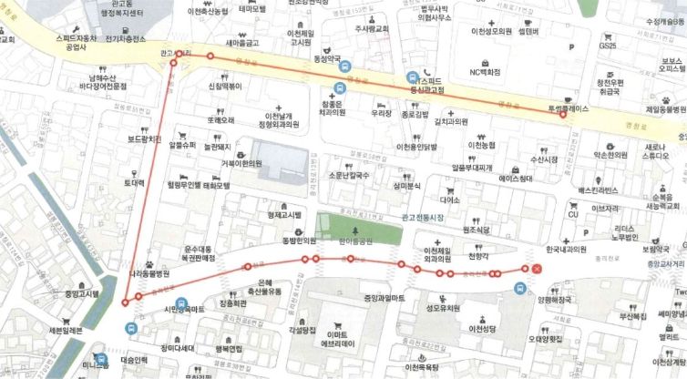 완화구간은 투썸플레이스에서 관고사거리 그리고 관고교, 이천성당으로 이어지는 ㄷ자형태구간이며 그 구간내에서는 주정차를 허용한다.