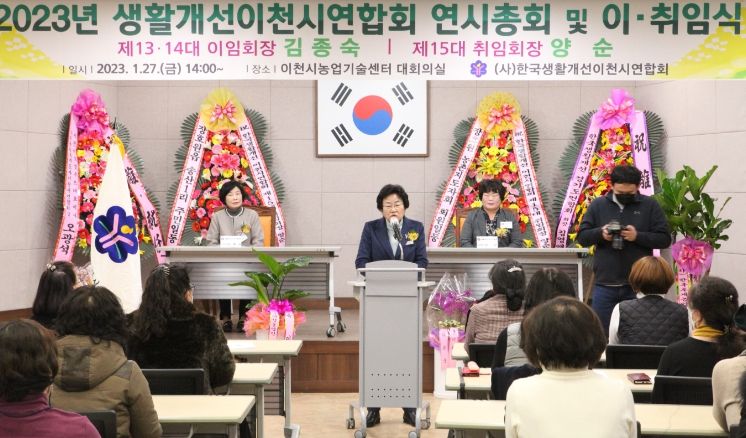 [한국기자연대] 한국생활개선이천시연합회는 27일 농업기술센터 대회의실에서 생활개선회 회원 70여명이 참석한 가운데 제13대·14대, 제15대 연합회장 이·취임식 및 2023년 연시총회를 실시했다.