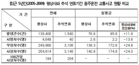 시기적 특성상 음주운전사고가 일평균 86건 발생해 평상시 77건 보다 약 12% 많았으며, 음주운전으로 인한 일평균 사상자수 또한 175명으로 평소의 141명에 비해 약 24% 더 많았다. 평상시에는 30대 운전자에 의한 음주운전사고가 많았던 것과 달리 추석연휴에는 20대 젊은 층이 음주운전사고를 많이 발생시킨 것으로 조사됐다.