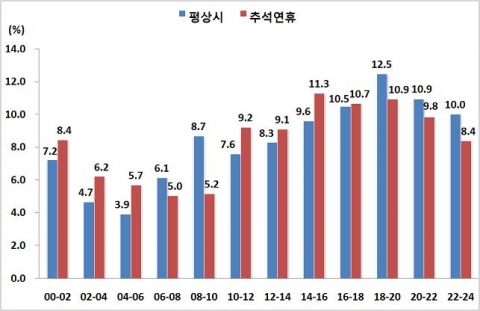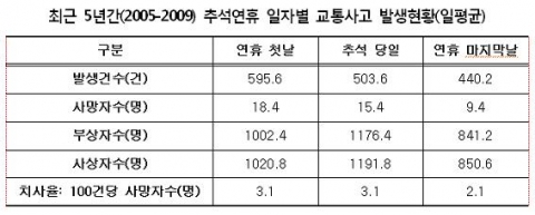특히 추석연휴 첫날이 발생건수와 사망자수 모두 가장 많았고 부상자수는 추석 당일이 가장 많은 것으로 나타났다