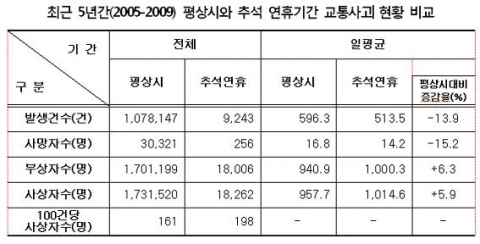 도로교통공단 교통사고종합분석센터는 15일 민족 최대의 명절인 추석에 사고발생빈도가 높은 도시 내 통행의 감소로 사고건수는 평상시 보다 줄어든 반면, 가족단위 이동에 따른 승차인원의 증가로 사고 시 평상시 보다 많은 사상자를 발생시킨 것으로 조사됐다고 밝혔다