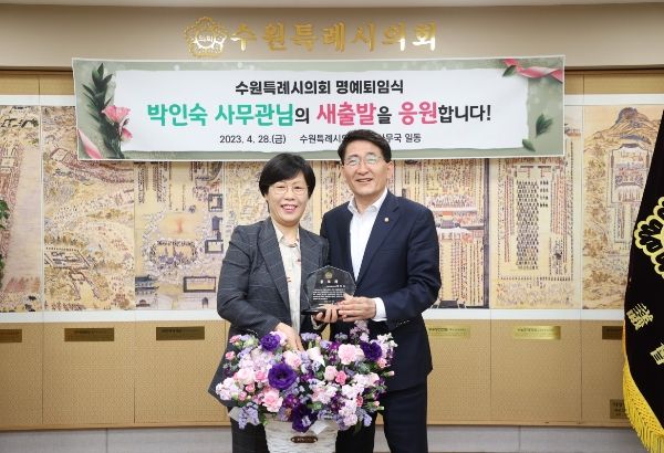[한국기자연대] 수원특례시의회는 28일 의장 집무실에서 명예퇴임식을 열었다. 김기정 의장은 박인숙 지방행정주사에게 지방행정사무관 특별승진 임용장과 공로패를 수여하고 그간의 노고를 격려했다.