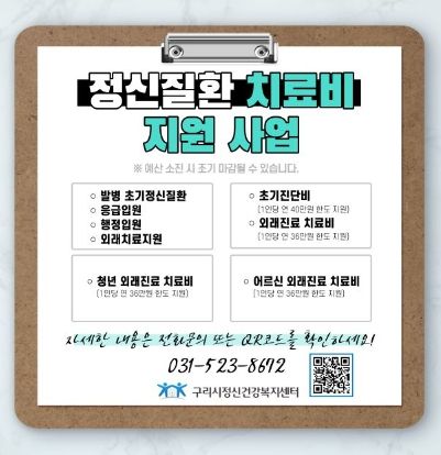 [한국기자연대] 구리시 정신건강복지센터는 정신질환 조기 발견 및 치료비 부담 경감과 대상자별 집중 치료를 유도하기 위해 다양한 치료비 지원사업을 추진하고 있다.