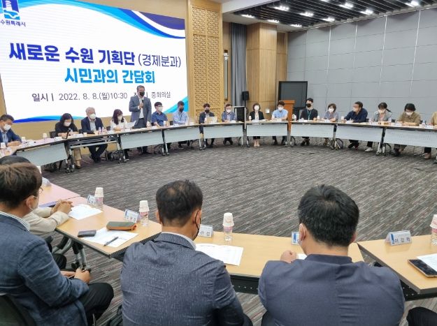 [한국기자연대] 새로운 수원기획단 경제분과가 8일 수원시청 중회의실에서 간담회를 열고, 지역 경제인들의 의견을 들었다.