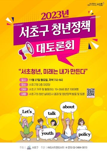 서울 서초구는 오는 27일 오후 7시 구청 대강당에서 ‘서초구 청년정책 대토론회’를 연다.