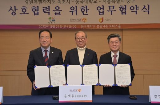 [한국기자연대] 서울 중구가 지난 24일 동국대학교 로터스홀에서 속초시·동국대학교와 상생발전을 위한 3개 기관 업무협약을 체결했다.