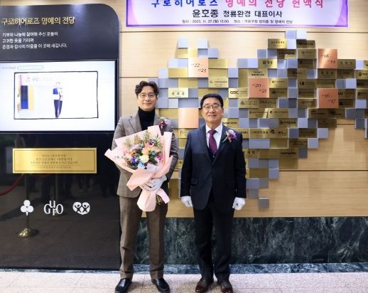 문헌일 구청장은 윤 대표에게 사회공헌 인증서를 전달하고 구청 본관 1층 구로히어로즈 명예의 전당에 명패를 등재했다.