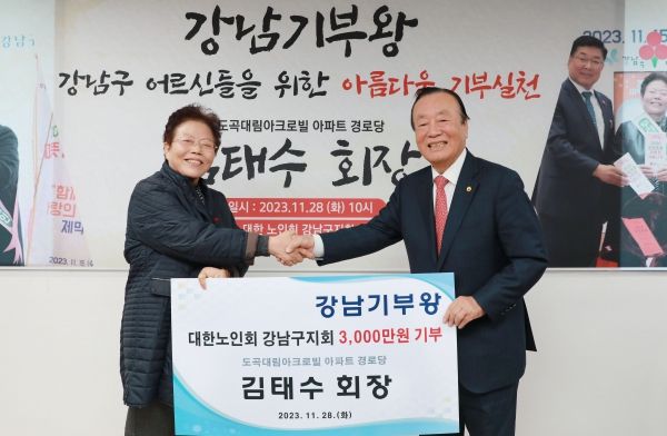 [한국기자연대] ‘강남구 기부왕’으로 알려진 김태수 도곡대림아크로빌 경로당 회장이 28일 경로당 발전을 위해 (사)대한노인회 강남구지회에 3천만원을 기부했다.