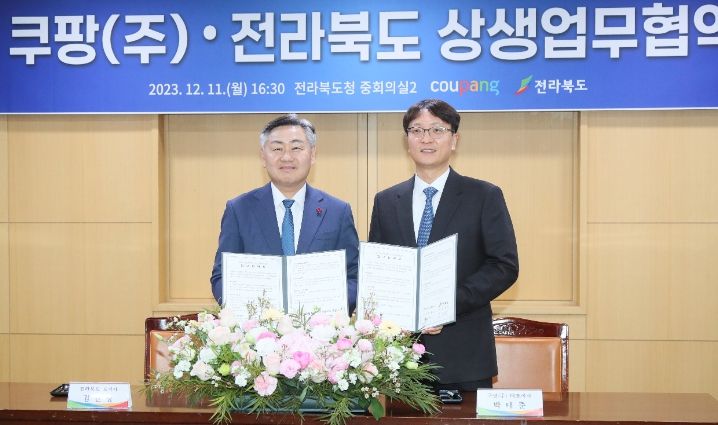 [한국기자연대] 쿠팡(주)와 전북도는 11일 전북도청에서 전북경제 활성화를 위해 서로 협력하자며 ‘상생협력에 관한 업무협약’을 체결했다.