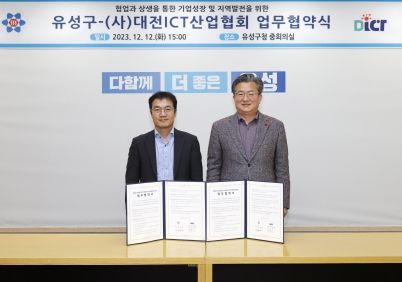 [한국기자연대] 대전 유성구는 12일 유성구청 중회의실에서 (사)대전ICT산업협회와 지역 중소(벤처)기업의 전문적 지원 및 상호협력 체계 구축을 위한 업무협약을 체결했다고 밝혔다.