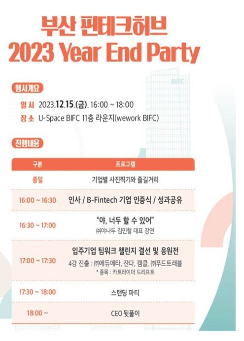 이번 행사는 부산 핀테크 허브 내 입주한 스타트업 기업의 성장을 격려하기 위한 자리로, ▲기업 성과공유 ▲'B-Fintech 20' 기업 인증식 ▲(주)야나두 김민철 대표의 강연 ▲입주기업 팀워크 챌린지 및 네트워킹 등으로 진행될 예정이다.